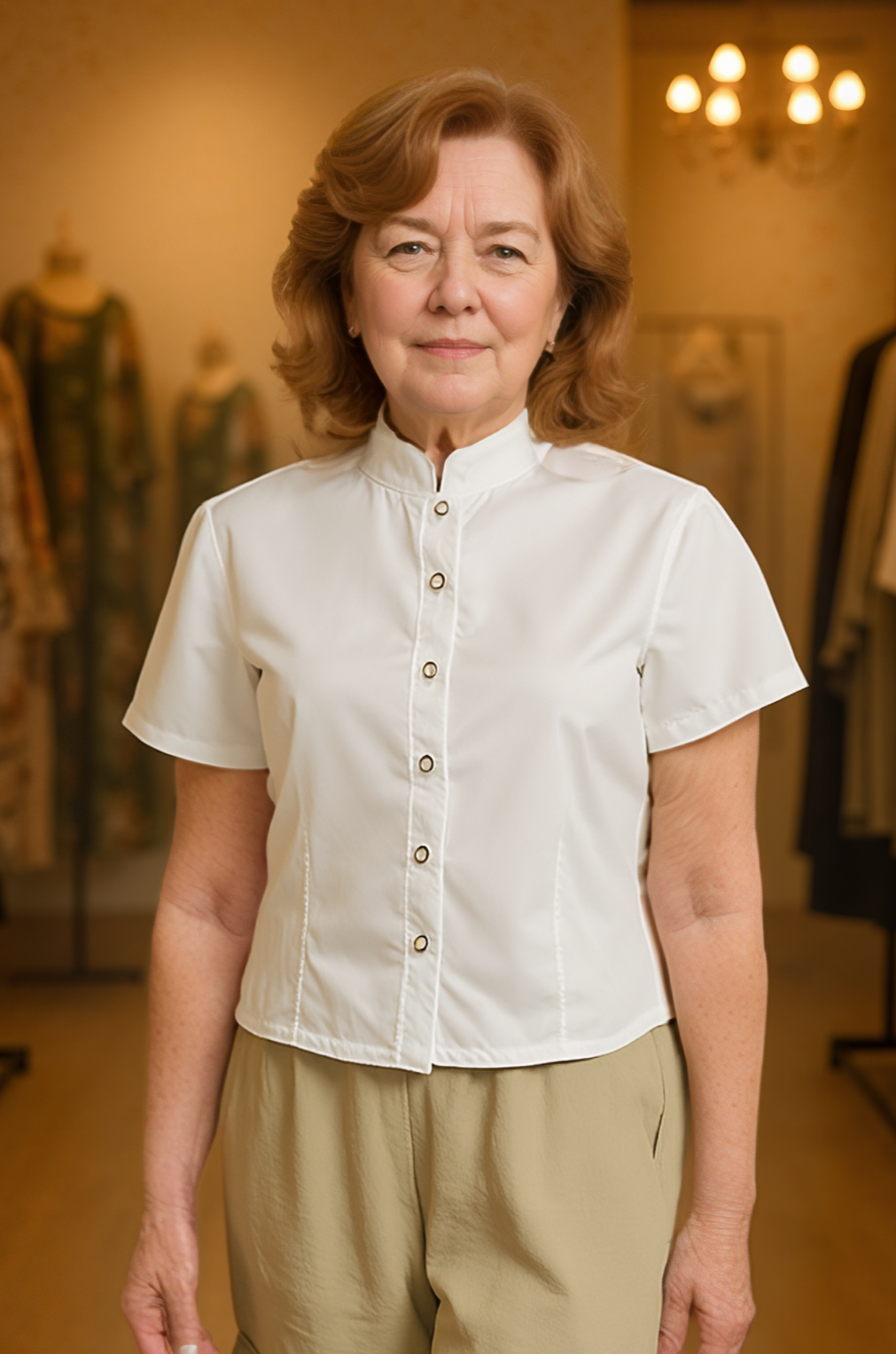 A crisp button down featuring a standing collar, mother of pearl buttons, and flattering darts.